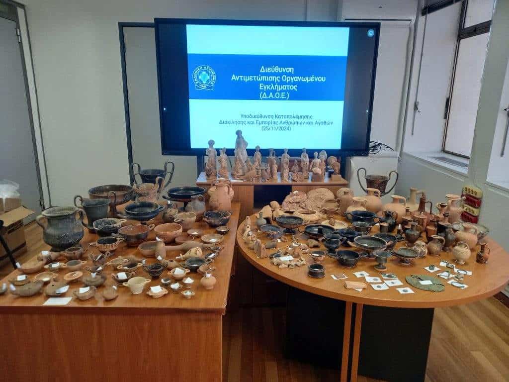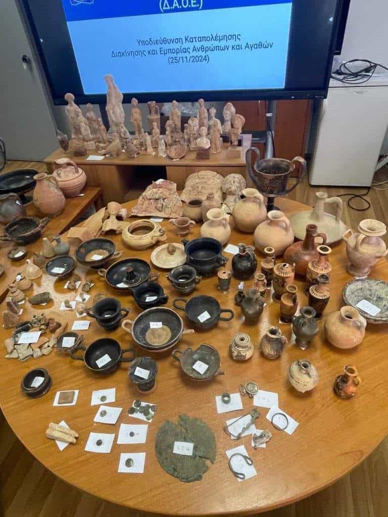 Όπως αναφέρει η ανακοίνωση της ΕΛΑΣ, ενδεικτικά, κατασχέθηκαν κύλικες, φιαλίδια, λήκυθοι, πήλινα ειδώλια και ομοιώματα, πρόχοι, μικρογραφικοί σκύφοι αρχαϊκής και κλασικής/ελληνιστικής περιόδου, πήλινοι λύχνοι ρωμαϊκών/βυζαντινών χρόνων, χάλκινα και αργυρά νομίσματα, καθώς και θραύσματα κεραμικής.