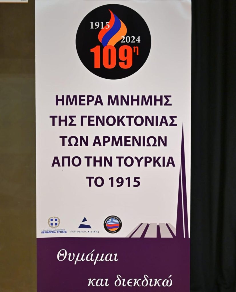 Απευθύνοντας χαιρετισμό στην ειδική εκδήλωση που συνδιοργάνωσε η Περιφέρεια Αττικής με την Αρμενική Εθνική Επιτροπή Ελλάδας, στο Ωδείο Αθηνών, ανέφερε πως «σήμερα τιμούμε τα αθώα θύματα ενός οργανωμένου, στοχευμένου εγκλήματος από την τότε Οθωμανική Αυτοκρατορία. Την 24η Απριλίου 1915, οι τουρκικές αρχές συνέλαβαν, βασάνισαν και εκτέλεσαν 250 Αρμένιους διανοούμενους στην Κωνσταντινούπολη, σηματοδοτώντας την αρχή της εξόντωσης ενός ολόκληρου λαού. Μέχρι το 1917 ο τραγικός απολογισμός ήταν ενάμιση εκατομμύριο νεκροί. Αποτέλεσε τον προάγγελο της Γενοκτονίας των Ποντίων, της καταστροφής του Μικρασιατικού Ελληνισμού και του Ολοκαυτώματος των Εβραίων. Πρόκειται για εγκλήματα που δεν πρέπει να ξεχαστούν».