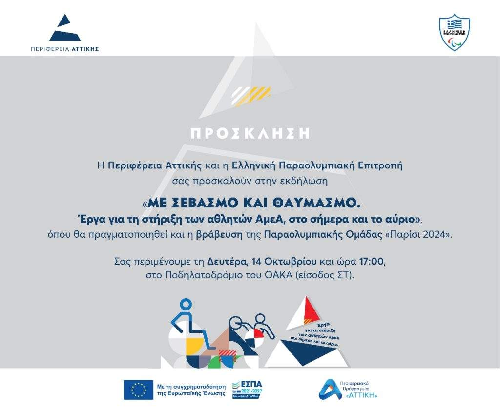 Στην εκδήλωση θα παρουσιαστούν δύο από τα εμβληματικά έργα της Περιφέρειας Αττικής για τους αθλητές ΑμεΑ και θα ακολουθήσει η βράβευση της Παραολυμπιακής Ομάδας του Παρισιού 2024.
