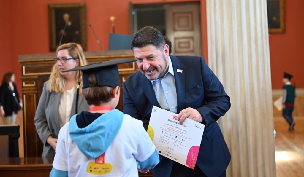 Παρουσία του Περιφερειάρχη Νίκου Χαρδαλιά, πραγματοποιήθηκε στην εμβληματική κεντρική αίθουσα του ΕΚΠΑ στα Προπύλαια, η τελετή αποφοίτησης των παιδιών που συμμετείχαν στο Παιδικό Πανεπιστήμιο της Περιφέρειας Αττικής, σηματοδοτώντας με αυτόν τον τρόπο την επίσημη ολοκλήρωση του φετινού κύκλου μαθημάτων. «Σήμερα ολοκληρώνεται ένα