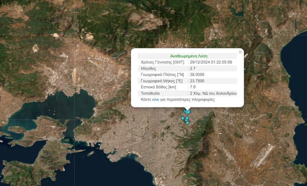 Η τελευταία σεισμική δόνηση σημειώθηκε στις 08:54 μεγέθους 2,2 βαθμών της κλίμακας Ρίχτερ, 5,2 χιλιόμετρα ανατολικά, βορειοανατολικά της Αθήνας, με εστιακό βάθος τα 2 χιλιόμετρα.