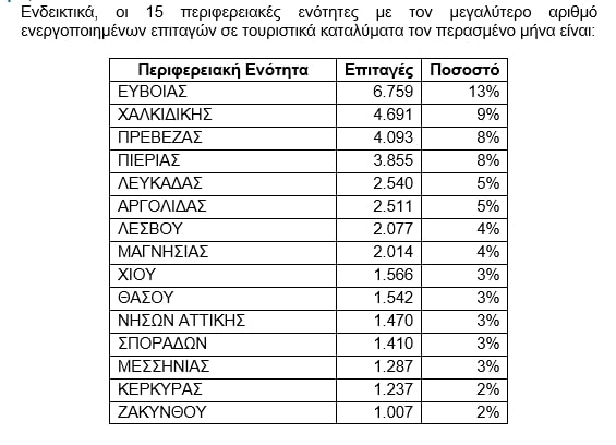 Παρακάτω ο πίνακας με τις 15 περιφερειακές ενότητες που καταγράφουν τον μεγαλύτερο αριθμό ενεργοποιημένων επιταγών σε τουριστικά καταλύματα τον περασμένο μήνα.