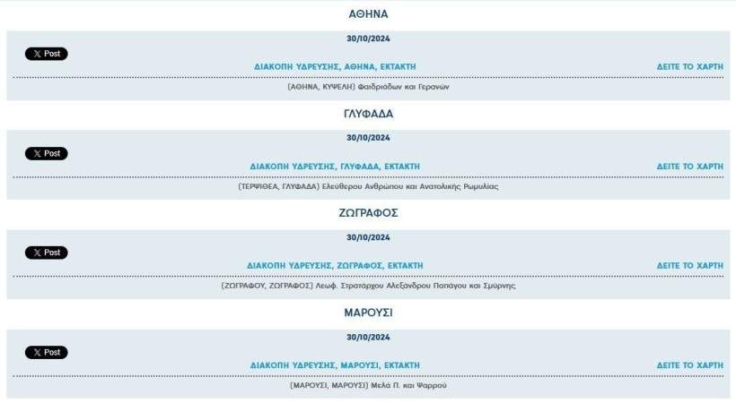 Προγραμματισμένες διακοπές νερού σε τέσσερις περιοχές της Αττικής, αναμένεται να πραγματοποιηθούν σήμερα Τετάρτη 30 Οκτωβρίου.
