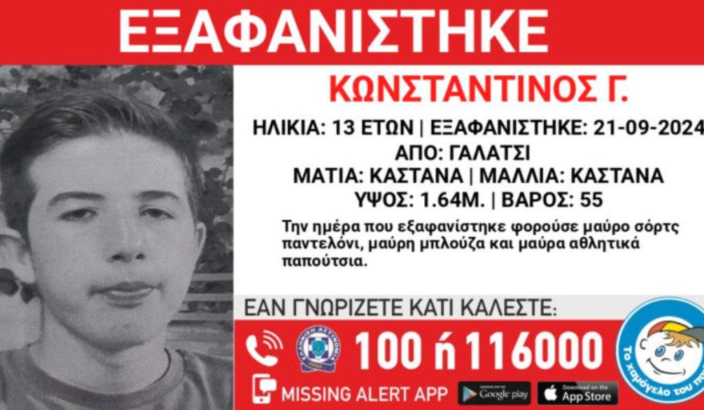Στις 21/09/24, πρωινές ώρες, εξαφανίστηκε από το Γαλάτσι ο Κωνσταντίνος Γ., 13 ετών. Το «Χαμόγελο του Παιδιού» προχώρησε άμεσα στη δημοσιοποίηση των στοιχείων του ανήλικου, καθώς ενδέχεται να συντρέχουν λόγοι που θέτουν τη ζωή του σε κίνδυνο. Ο Κωνσταντίνος Γ. έχει καστανά μαλλιά και καστανά μάτια, έχει ύψος 1,64 μ. και είναι 55 κιλά. Την ημέρα που εξαφανίστηκε φορούσε μαύρο σορτς, μαύρη μπλούζα και μαύρα αθλητικά παπούτσια.