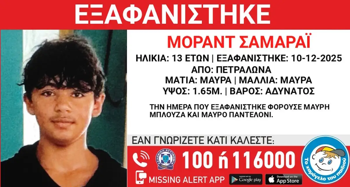 Η αγωνία κορυφώνεται για τον 13χρονο Μοράντ Σαμαράι, με καταγωγή από το Ιράκ, ο οποίος εξαφανίστηκε από χώρο φιλοξενίας ασυνόδευτων ανηλίκων στα Πετράλωνα το απόγευμα της 10ης Δεκεμβρίου 2025. Το «Χαμόγελο του Παιδιού» ενημερώθηκε για το περιστατικό μία ημέρα αργότερα και προχώρησε άμεσα στη δημοσιοποίηση των στοιχείων του, καθώς εκτιμάται ότι η ζωή του μπορεί να βρίσκεται σε κίνδυνο.