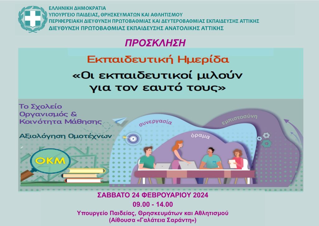 Ημερίδα του Ερευνητικού Πιλοτικού Προγράμματος «Το σχολείο ως Οργανισμός και Κοινότητα Μάθησης», με τίτλο: «Οι εκπαιδευτικοί μιλούν για τον εαυτό τους», θα πραγματοποιηθεί το Σάββατο, 24 Φεβρουαρίου 2024, και ώρα 9:00 – 14:00, στην αίθουσα «Γαλάτεια Σαράντη» του Υ.ΠΑΙ.Θ.Α.