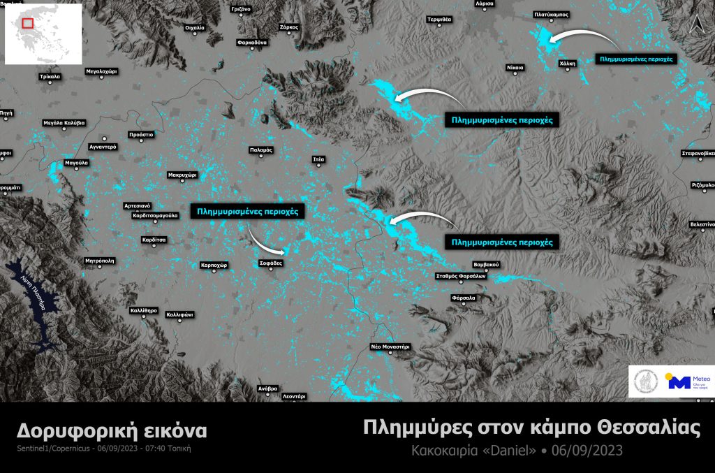 Δορυφορικά δεδομένα από το ραντάρ του ευρωπαϊκού δορυφόρου Sentinel-1 που πέρασε πάνω από τη χώρα μας το απόγευμα της Πέμπτης 7 Σεπτεμβρίου 2023, δείχνουν ότι ένα μεγάλο μέρος του κάμπου της Θεσσαλίας έχει πλημμυρίσει.
