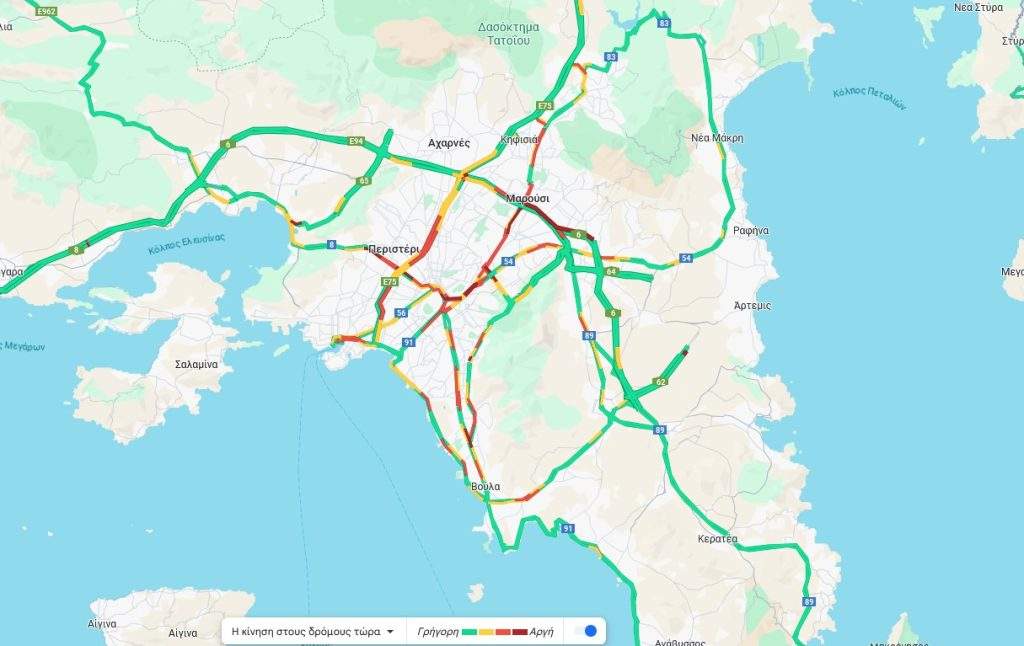 Την ίδια ώρα τεράστιες είναι οι καθυστερήσεις και στη λεωφόρο Κηφισίας με τα οχήματα να κινούνται με ιδιαίτερα αργούς ρυθμούς. Στο ίδιο μήκος κύματος και η κίνηση στον Κηφισό.