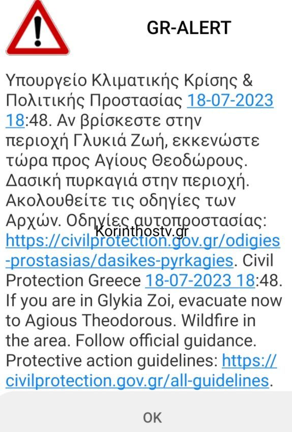 Η φωτιά στο Πανόραμα Αγίων Θεοδώρων συνεχίζει να κατακαίει ότι βρίσκεται στο διάβα της, ενώ οι κάτοικοι του οικισμού «Γλυκιά Ζωή» Αγίων Θεοδώρων δέχτηκαν μήνυμα 112 στα κινητά τους που τους καλούν να εγκαταλείψουν την περιοχή και μάλιστα άμεσα.