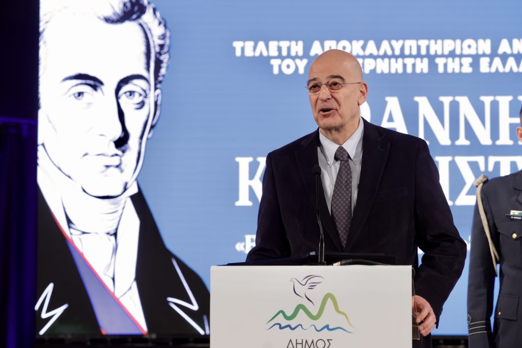 Εκπροσωπώντας τον Πρωθυπουργό, ο Υπουργός Εθνικής Άμυνας Νίκος Δένδιας τόνισε στον χαιρετισμό του: «Κύριε Δήμαρχε, σας αξίζει έπαινος και σε εσάς και στο Δημοτικό Συμβούλιο και στους δημότες σας που στήριξαν και στηρίζουν αυτή την προσπάθεια, όπως και στον γλύπτη ο οποίος έφτιαξε το άγαλμα αυτό. Γιατί ακριβώς, όπως είπατε, αυτό που έχει σημασία δεν είναι η βελτίωση μιας πλατείας αισθητικά. Είναι η δημιουργία προτύπων στη νέα γενιά. Αυτό προσφέρετε και σας συγχαίρω για αυτό». Και πρόσθεσε: «Σήμερα, μετά από τόσα πολλά χρόνια, 200 χρόνια μετά την ελληνική επανάσταση, λίγο πριν γιορτάσουμε τα 200 χρόνια από την ίδρυση του νέου ελληνικού κράτους, η Πατρίδα μας χρειάζεται θεσμική ενίσχυση. Χρειάζεται να απευθυνθούμε στην ελληνική κοινωνία και να την ξαναπείσουμε, να της δημιουργήσουμε ξανά εμπιστοσύνη στην ισχύ των θεσμών. Των θεσμών που ο Καποδίστριας προσπάθησε και θυσιάστηκε στην προσπάθεια για να δημιουργήσει».
