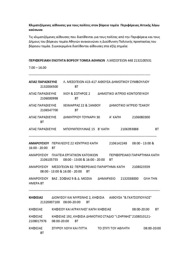 Ενόψει των υψηλών θερμοκρασιών που αναμένονται τα επόμενα 24ωρα σύμφωνα με τις μετεωρολογικές προβλέψεις της ΕΜΥ, οι Περιφερειακές Ενότητες της Περιφέρειας Αττικής σε συνεργασία με τους Δήμους της Αττικής, θέτουν στη διάθεση των πολιτών κλιματιζόμενους χώρους (π.χ. ΚΑΠΗ, αίθουσες Δήμων, γυμναστήρια κλπ).