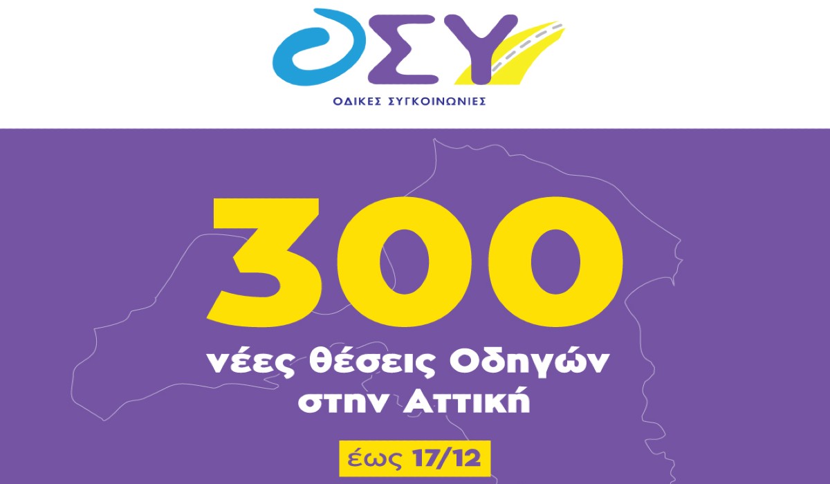 Συνεχίζεται η διαδικασία υποβολής αιτήσεων για τις 300 μόνιμες θέσεις οδηγών, στην ΟΣΥ, στο πλαίσιο της ενίσχυσης του ανθρώπινου δυναμικού και της βελτίωσης των αστικών συγκοινωνιών.