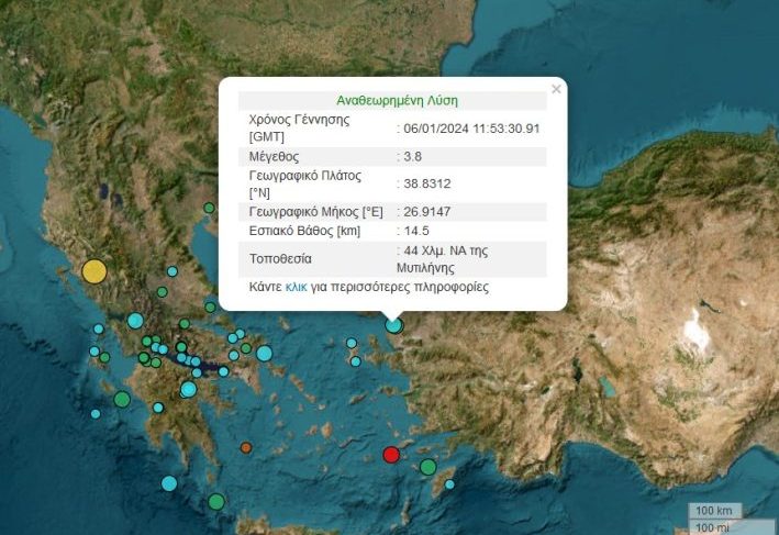 Σεισμική δόνηση εντάσεως 3,8 βαθμών της κλίμακας Ρίχτερ, σημειώθηκε στις 13:53 το μεσημέρι του Σαββάτου 6 Ιανουαρίου, 38 χιλιόμετρα ΝΑ της Μυτιλήνης στα τουρκικά παράλια.