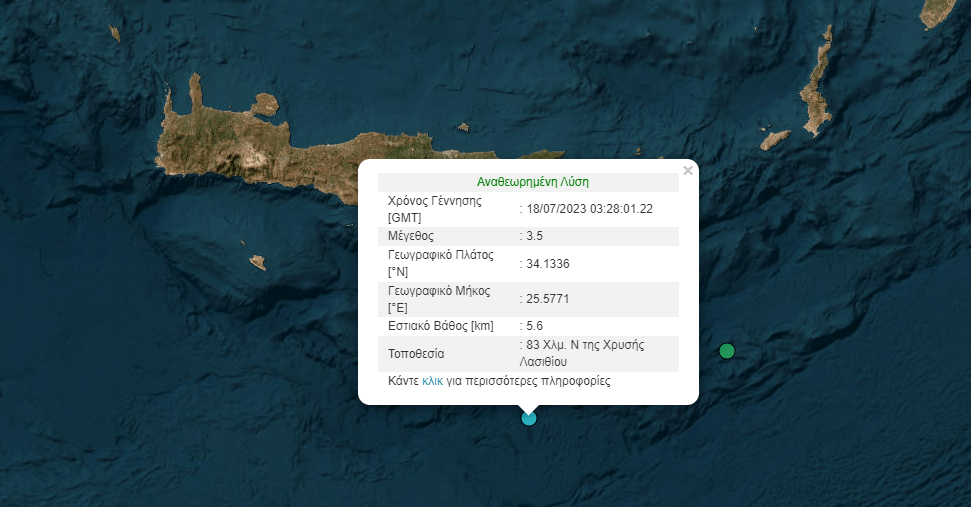 Συγκεκριμένα, σύμφωνα με το Γεωδυναμικό Ινστιτούτο του Εθνικού Αστεροσκοπείου Αθηνών, ο σεισμός καταγράφηκε 83 χιλιόμετρα νότια της Χρυσής Λασιθίου.