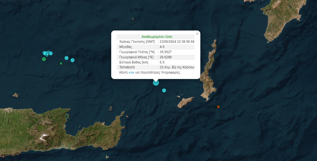 Σεισμός 4 βαθμών της κλίμακας Ρίχτερ καταγράφτηκε στις 01:39 στον θαλάσσιο χώρο 33 χιλιόμετρα βορειοδυτικά της Κάσσου, ή 374 χιλιόμετρα νοτιοανατολικά της πρωτεύουσας. σύμφωνα με δεδομένα του Γεωδυναμικού Ινστιτούτου του Εθνικού Αστεροσκοπείου της Αθήνας.