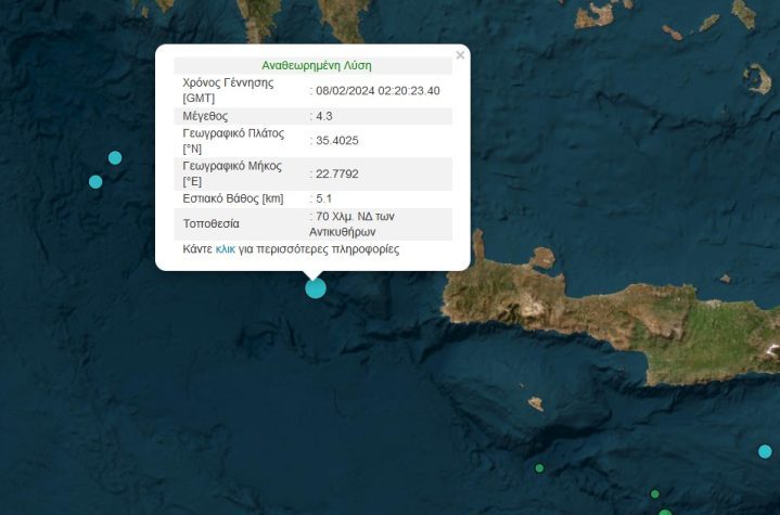 Το επίκεντρο της σεισμικής δόνησης ήταν στο θαλάσσιο χώρο, 70 χλμ. ΝΔ των Αντικυθήρων, σύμφωνα με το Ενιαίο Εθνικό Σεισμολογικό Δίκτυο και το Γεωδυναμικό Ινστιτούτο του Εθνικού Αστεροσκοπείου Αθηνών.