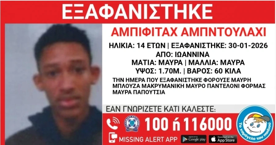 Ειδικότερα, στις 30/01/2026 στις 18:00 εξαφανίστηκε από χώρο φιλοξενίας ασυνόδευτων ανηλίκων στην περιοχή των Ιωαννίνων o (επ.) ABDULAHI ABDIFITAH(ον) 14 ετών, σομαλικής καταγωγής.