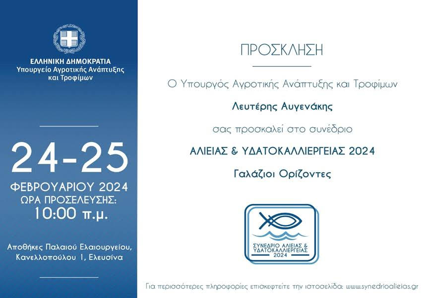 Συνέδριο Αλιείας και Υδατοκαλλιέργειας διοργανώνει στις 24 και 25 Φεβρουαρίου το ΥΠΑΑΤ υπό τον Λευτέρη Αυγενάκη.