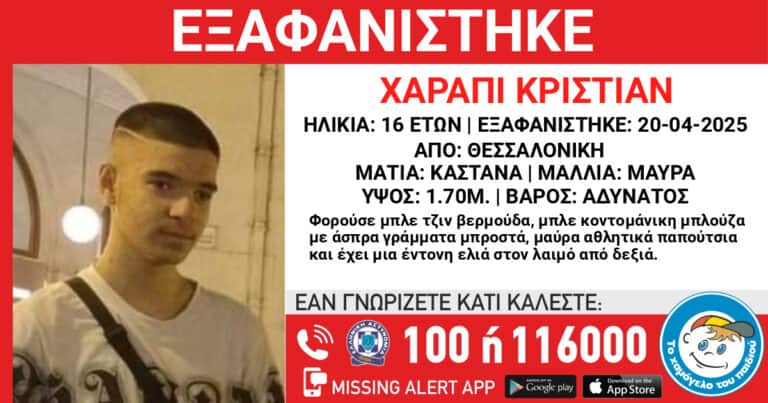Ο 16χρονος Χαραπι Κριστιαν εξαφανίστηκε από την περιοχή της Θεσσαλονίκης στις 20/04/25 και ώρα 13:00. Το «Χαμόγελο του Παιδιού» ενημερώθηκε στις 21/04/2025 και προχώρησε στην δημοσιοποίηση των στοιχείων του ανήλικου, κατόπιν αιτήματος της οικογένειάς του, καθώς ενδέχεται να συντρέχουν λόγοι που θέτουν τη ζωή του σε κίνδυνο.