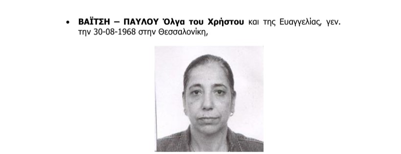 ΒΑΪΤΣΗ – ΠΑΥΛΟΥ Όλγα του Χρήστου και της Ευαγγελίας, γεν. την 30-08-1968 στην Θεσσαλονίκη,