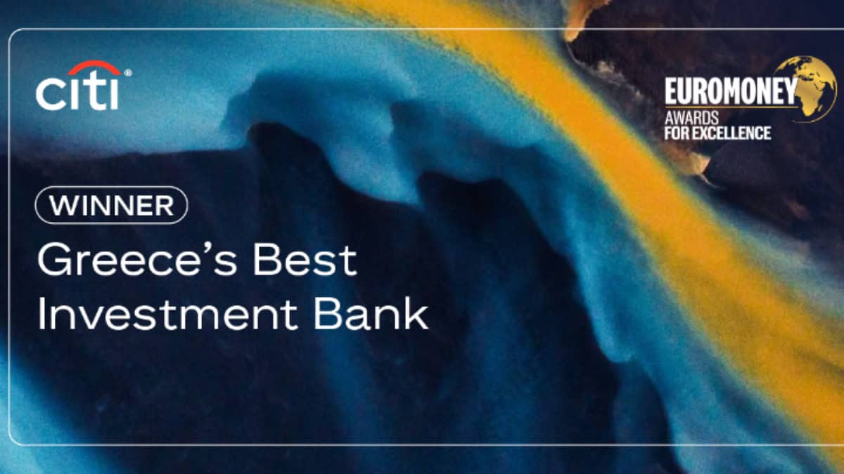 Τον τίτλο της Best Investment Bank στην Ελλάδα έλαβε η Citi Ελλάδος, σύμφωνα με τη φετινή αξιολόγηση του διεθνώς καταξιωμένου περιοδικού Euromoney, με την τράπεζα να λαμβάνει επίσης τη διάκριση Best Investment Bank for Debt Capital Markets (DCM), για τις επιδόσεις της και την καινοτομία που φέρνει στην ελληνική αγορά ομολόγων.