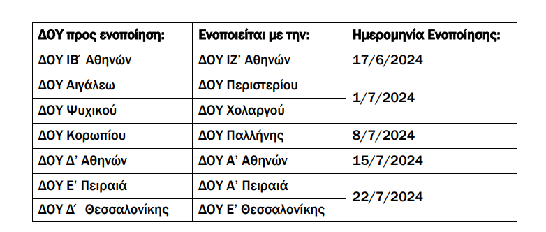 Για την υλοποίηση του σχεδιασμού αυτού, με απόφαση του διοικητή της ΑΑΔΕ ενοποιούνται οι παρακάτω ΔΟΥ Αττικής και Θεσσαλονίκης με όμορη χωρική αρμοδιότητα, ως εξής: