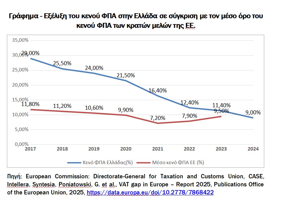 Η μείωση κατά 17,6 εκατοστιαίες μονάδες, την περίοδο 2017–2023, αποτελεί τη μεγαλύτερη μείωση μεταξύ των κρατών μελών της ΕΕ, επιβεβαιώνοντας τη σημαντική ενίσχυση της φορολογικής συμμόρφωσης.