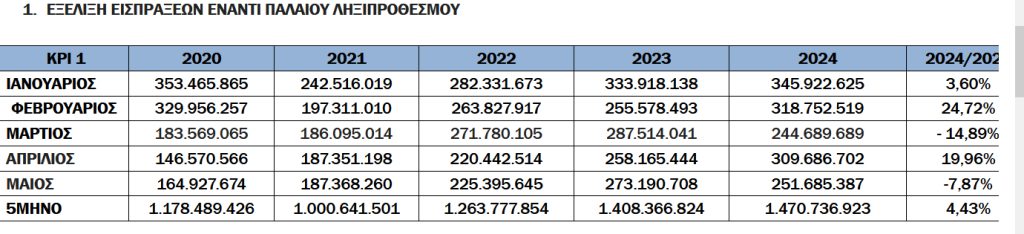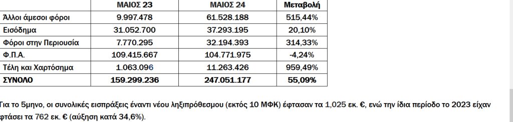 Για το μήνα αναφοράς (Μάιος) οι συνολικές εισπράξεις έναντι νέου ληξιπρόθεσμου (εκτός 10 ΜΦΚ) έφτασαν τα 265 εκ. €, ενώ την αντίστοιχη περίοδο του 2023 έφτασαν τα 171 εκ. € (αύξηση κατά 54,9%).
