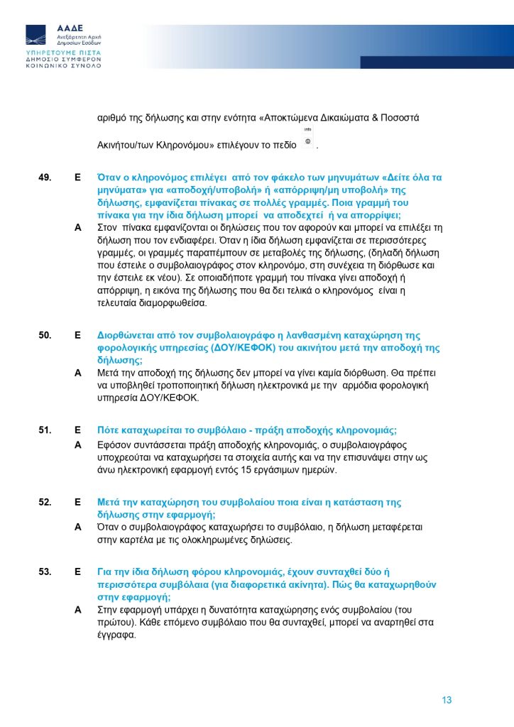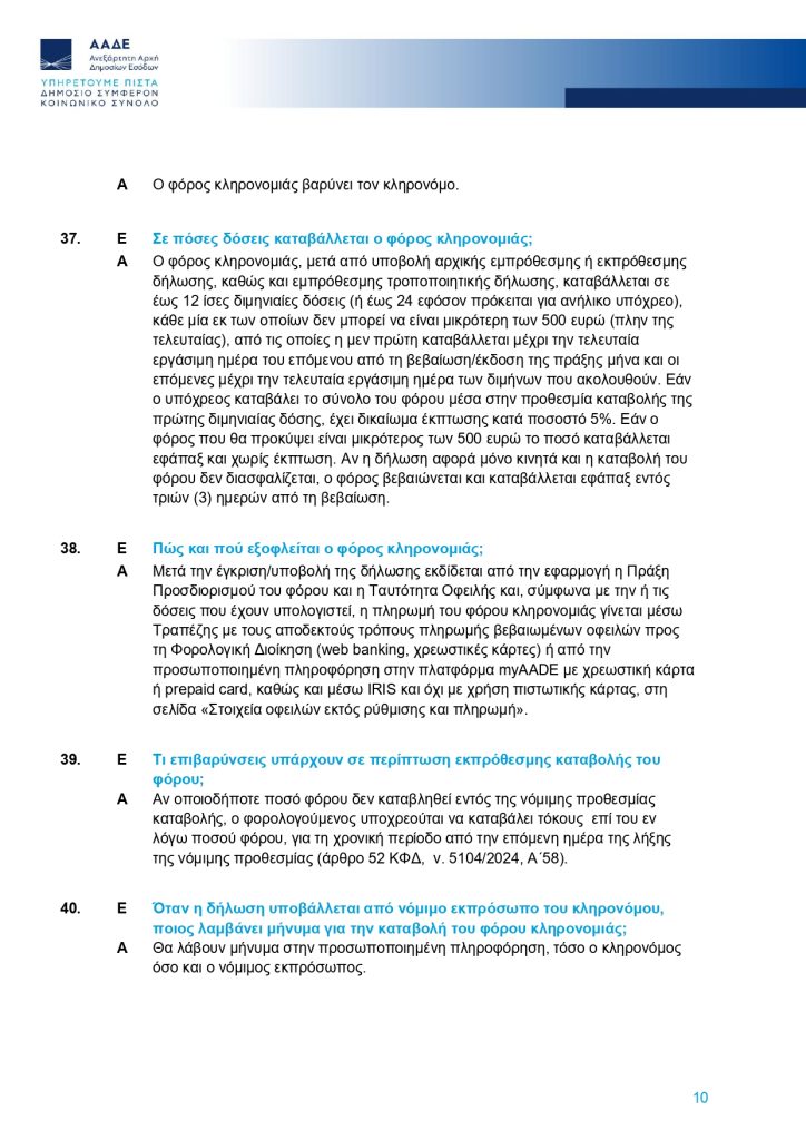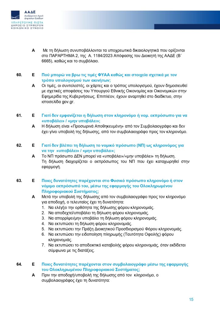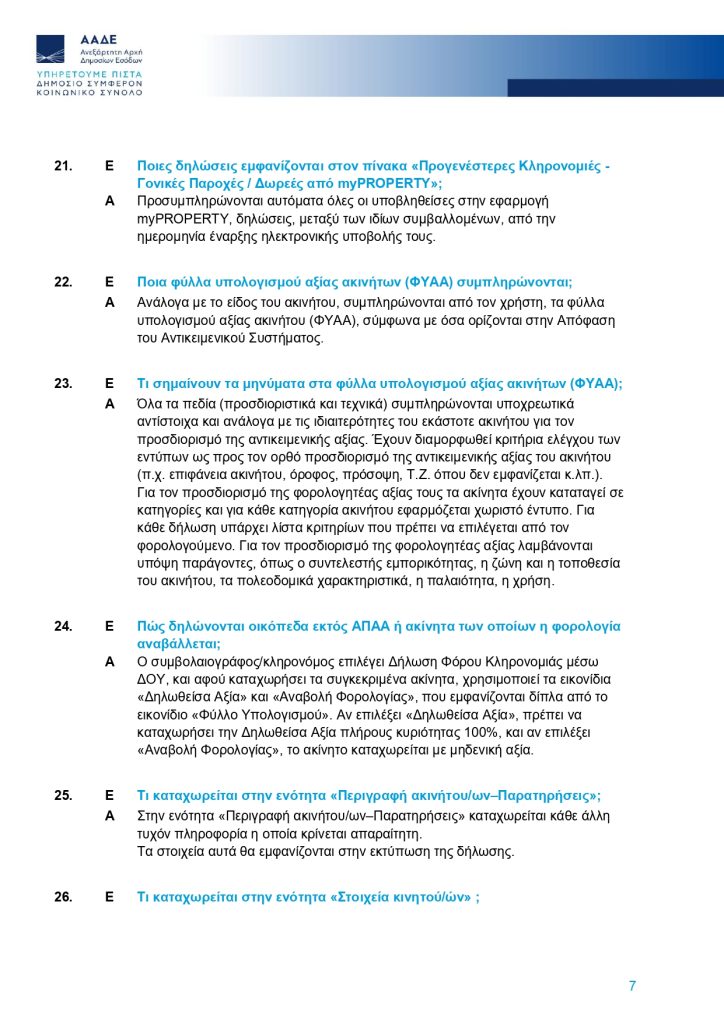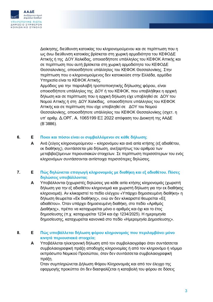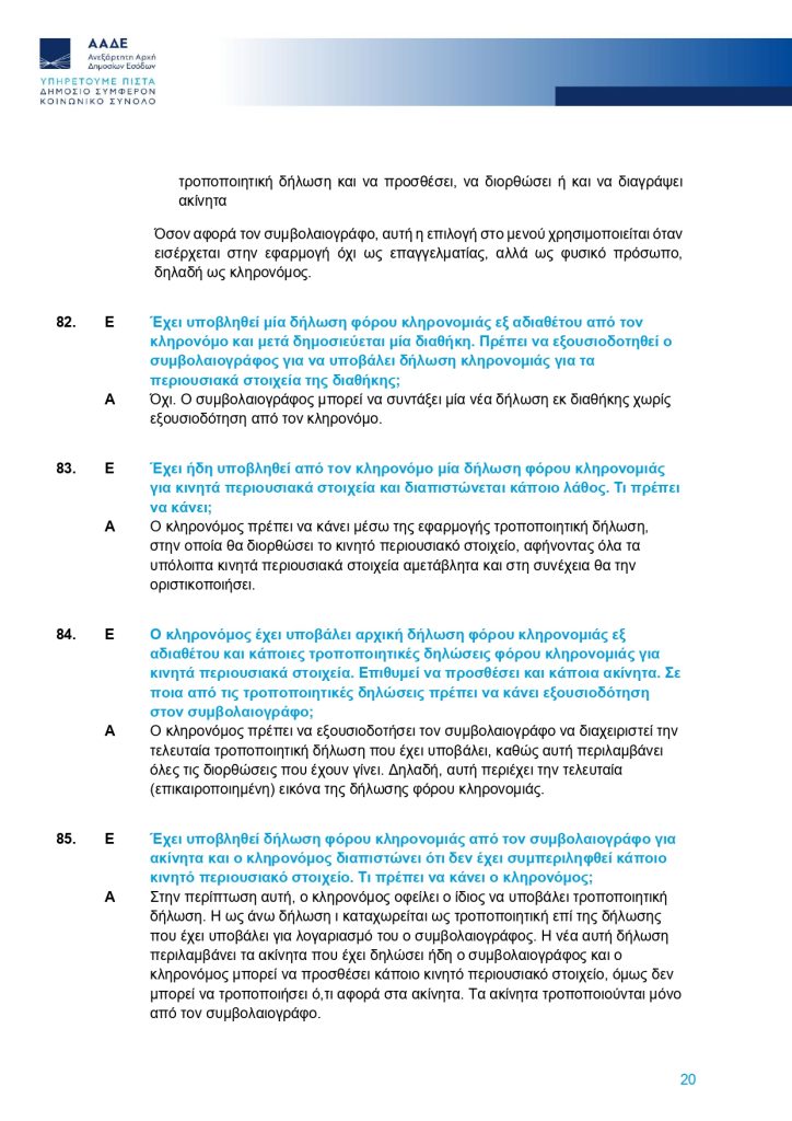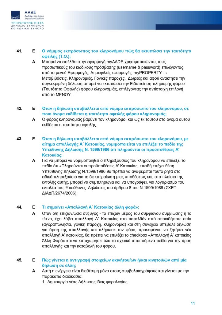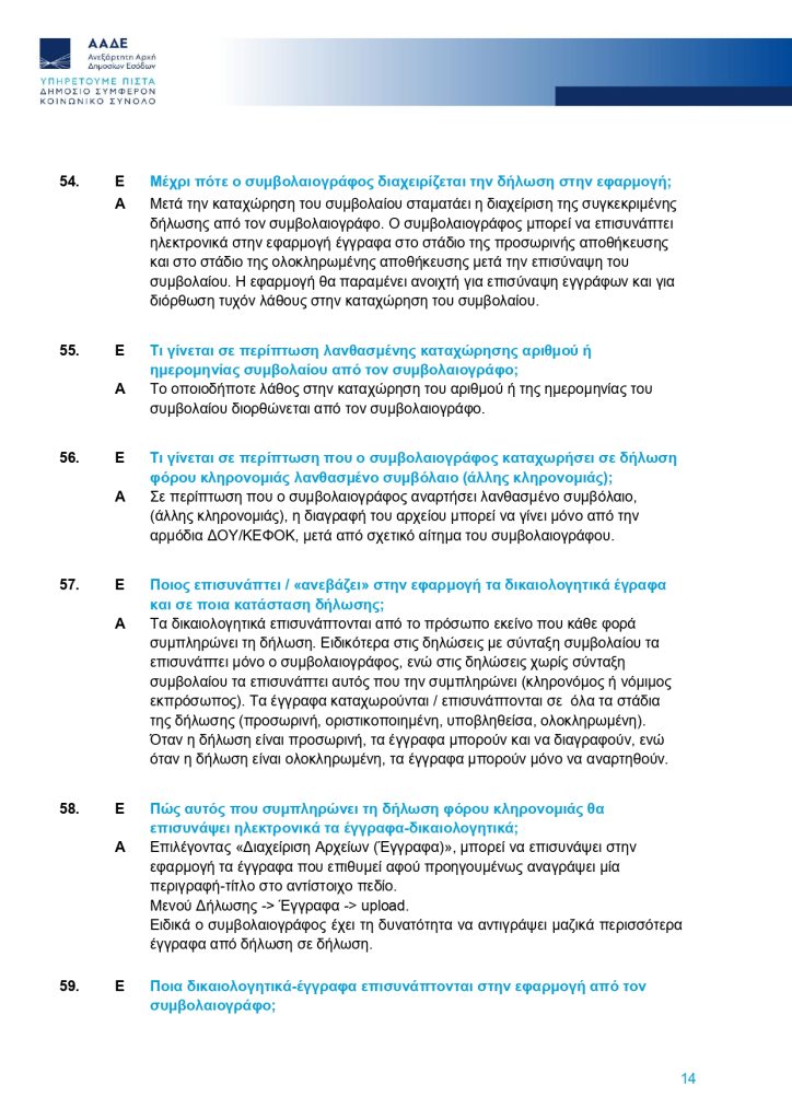 Για τα θέματα αυτά, ο νέος χρηστικός οδηγός τον οποίο εξέδωσε η ΑΑΔΕ περιλαμβάνει συνολικά 86 συχνές ερωτήσεις – απαντήσεις που αφορούν τις διαδικασίες δήλωσης Φόρου Κληρονομιάς ή δήλωσης Φόρου Κληρονομιάς μέσω ΔΟΥ (στην πλατφόρμα myPROPERTY).