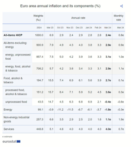 Euro area #inflation expected to be 2.4% in March 2024, down from 2.6% in February. Components: services +4.0%, food, alcohol & tobacco +2.7%, other goods +1.1%, energy ‑1.8% – flash estimate https://t.co/XV5xxaizCB pic.twitter.com/97f83o23S2