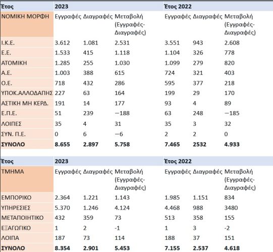 Όσον αφορά τους τομείς δραστηριότητας, πρωταγωνιστικό ρόλο είχαν οι υπηρεσίες με 5.370 νέες εγγραφές και θετικό ισοζύγιο 4.124 το 2023, έναντι του 3.480 το 2022. Ακολούθησαν οι τομείς του εμπορίου με 2.364 εγγραφές έναντι 1.221 διαγραφών και της μεταποίησης με 432 εγγραφές έναντι 359 διαγραφών.
