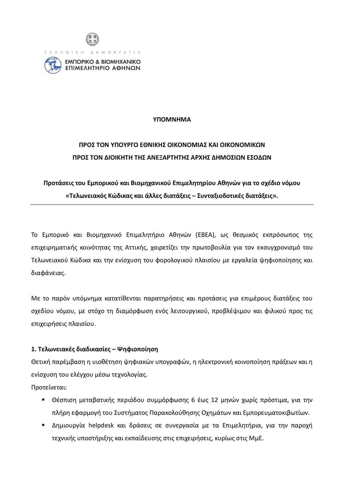 Το Εμπορικό και Βιομηχανικό Επιμελητήριο Αθηνών (ΕΒΕΑ), στο πλαίσιο του θεσμικού του ρόλου ως σύμβουλος της Πολιτείας για την ανάπτυξη και τη στήριξη της επιχειρηματικότητας, υπέβαλε υπόμνημα προς τον Υπουργό Εθνικής Οικονομίας και Οικονομικών, κ. Κυριάκο Πιερρακάκη και τον Διοικητή της Ανεξάρτητης Αρχής Δημοσίων Εσόδων, κ. Γιώργο Πιτσιλή, με αφορμή το σχέδιο νόμου «Εθνικός Τελωνειακός Κώδικας και άλλες διατάξεις – Συνταξιοδοτικές διατάξεις».