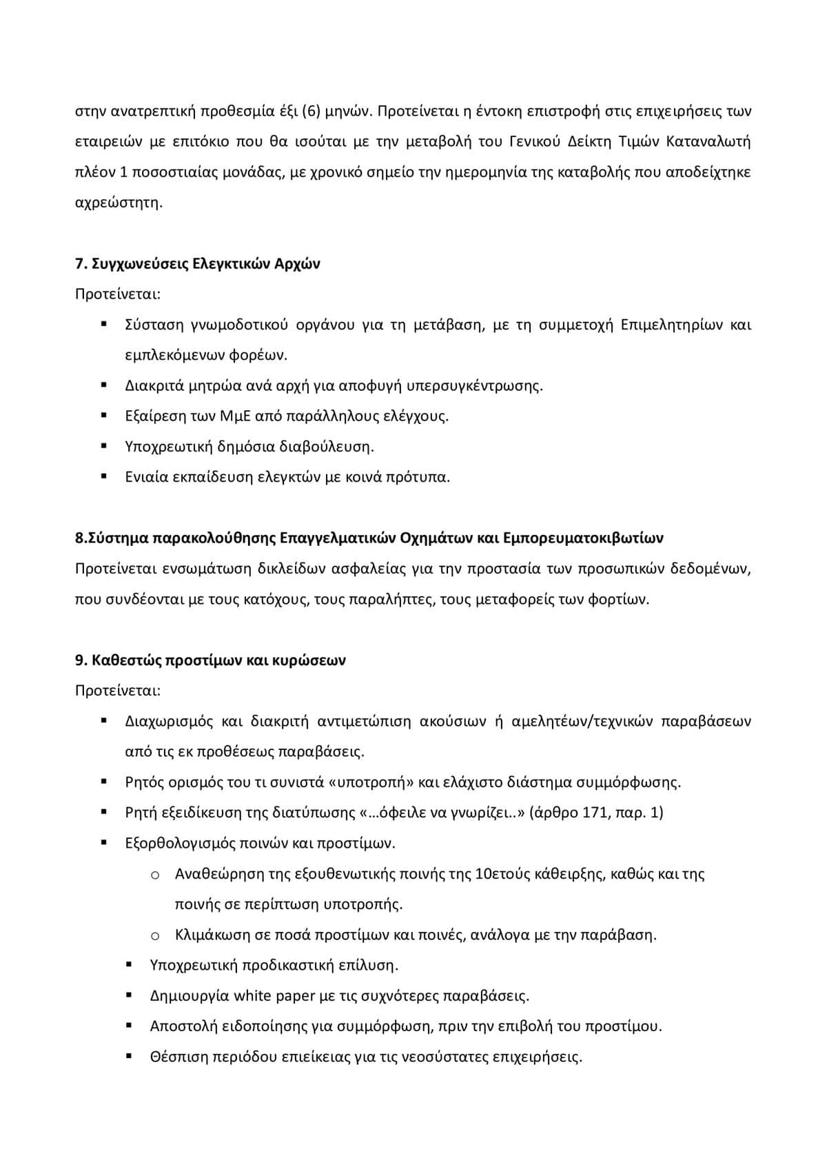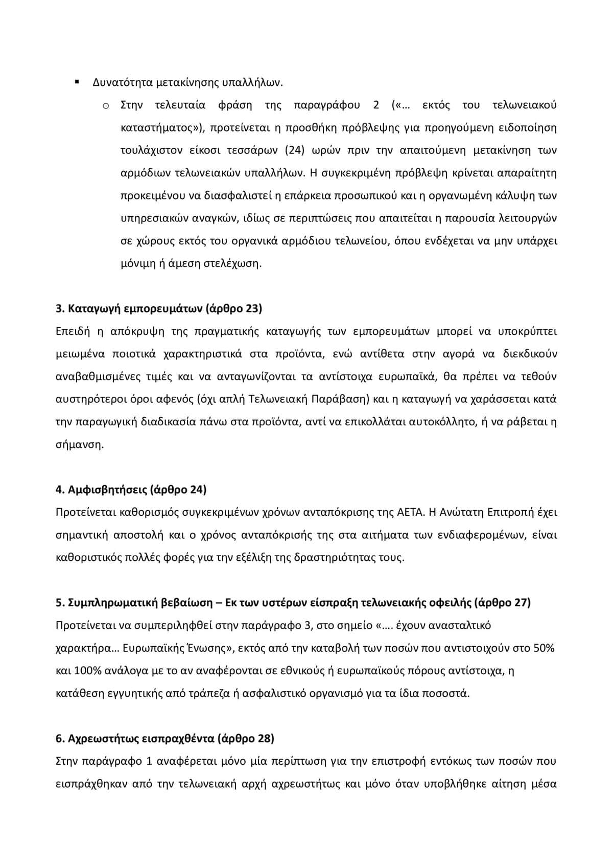 Ιδιαίτερη αναφορά γίνεται στην ανάγκη αυστηροποίησης των ρυθμίσεων σχετικά με την καταγωγή των προϊόντων, στην εξορθολογισμένη αντιμετώπιση των προστίμων και των κυρώσεων, με βάση το ιστορικό φορολογικής συνέπειας της επιχείρησης, και στη διαμόρφωση δικλείδων ασφαλείας για τα προσωπικά δεδομένα στο νέο σύστημα παρακολούθησης οχημάτων και φορτίων.