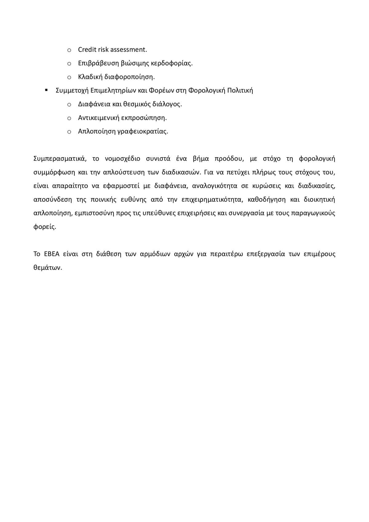 Όπως δήλωσε ο Πρόεδρος του ΕΒΕΑ, κ. Γιάννης Μπρατάκος: «Η Ελλάδα χρειάζεται ένα δίκαιο, λειτουργικό και αναπτυξιακό φορολογικό και τελωνειακό πλαίσιο, που θα διευκολύνει τις επιχειρήσεις και θα ενισχύει την εξωστρέφεια και τις επενδύσεις. Με το υπόμνημά μας συμβάλλουμε εποικοδομητικά στον δημόσιο διάλογο, προκειμένου το νέο πλαίσιο να ανταποκρίνεται στις ανάγκες της οικονομίας και να προωθεί την ανταγωνιστικότητα με διαφάνεια, αναλογικότητα και θεσμική συνεργασία».