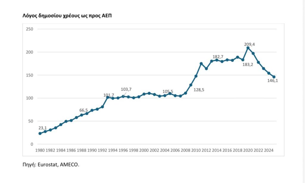 Ωστόσο, στο τέλος του 2025, ο λόγος χρέους προς ΑΕΠ περιορίστηκε στο 146,1%. Η υποχώρηση αυτή, ύψους σχεδόν 67 ποσοστιαίων μονάδων εντός τετραετίας, επιτεύχθηκε παρά τις πιέσεις που δέχθηκε η οικονομία από τη διπλή ενεργειακή και εφοδιαστική κρίση που πυροδότησε η εισβολή της Ρωσίας στην Ουκρανία.