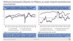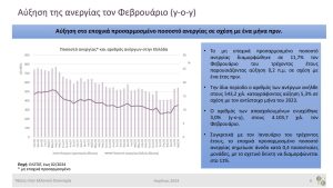 - Υποχώρηση για τη βιομηχανική παραγωγή τον Φεβρουάριο σε σύγκριση με τον Ιανουάριο. Αύξηση 1,5% (y-o-y) στην Ελλάδα, έναντι υποχώρησης 5,4% στην ΕΕ27. Βελτίωση για την εγχώρια Μεταποίηση 2,0% (y-o-y).
