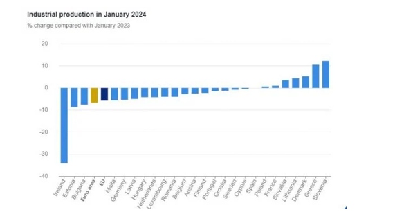 Σε ετήσια βάση η βιομηχανική παραγωγή μειώθηκε κατά 6,7% στην Ευρωζώνη και κατά 5,7% στην ΕΕ. Η Ελλάδα και σε αυτό τον δείκτη βρίσκεται μεταξύ των τριών χωρών με τη μεγαλύτερη ετήσια ανάπτυξη της βιομηχανικής παραγωγής. Στο σχετικό πίνακα πρώτη είναι η Σλοβενία με αύξηση 12,2%, δεύτερη η Ελλάδα με αύξηση 10,5% και τρίτη η Δανία με αύξηση 5,5%