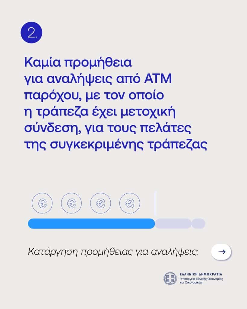 Εφόσον η τράπεζα στην οποία ο πολίτης διατηρεί τον λογαριασμό του έχει μετοχική σύνδεση με πάροχο ΑΤΜ (ATM operator), οι αναλήψεις στα ΑΤΜ του παρόχου ,δεν θα υπόκεινται σε οποιαδήποτε επιβάρυνση. - Πλαφόν προμήθειας 1,50 ευρώ για οποιαδήποτε άλλη χρέωση της τράπεζας σε ΑΤΜ (π.χ. ξένες τράπεζες που δεν συμμετέχουν στη ΔΙΑΣ), είτε χρεώσεις τρίτων παρόχων.