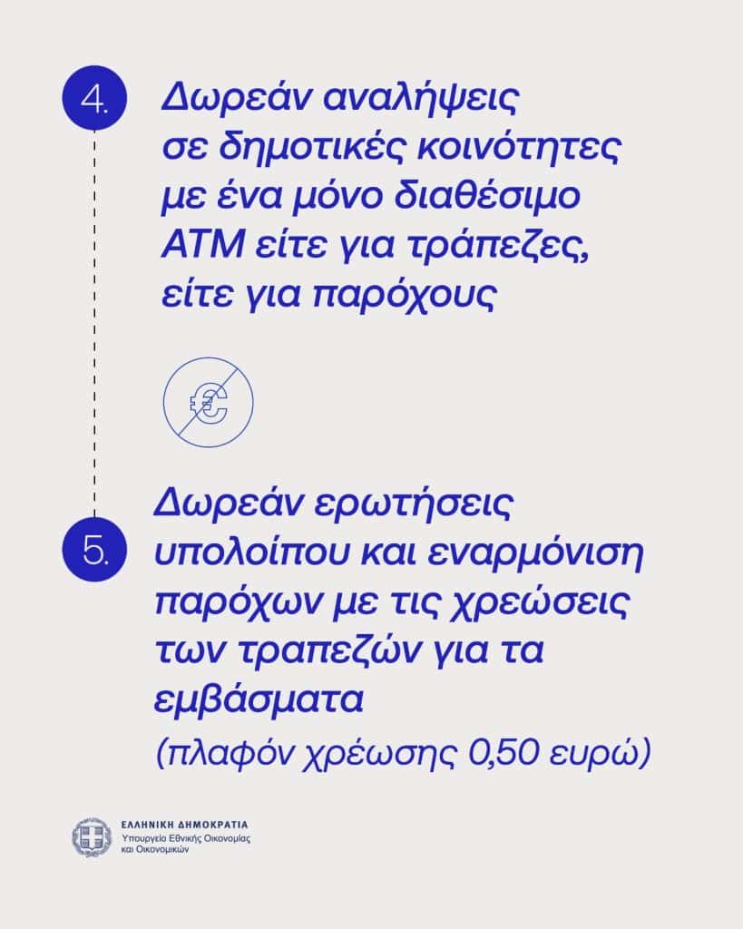 Σε όλες τις δημοτικές κοινότητες όπου λειτουργεί μόνο ένα ΑΤΜ (είτε τραπεζικό είτε παρόχου), οι αναλήψεις μετρητών θα πραγματοποιούνται χωρίς καμία προμήθεια, ανεξαρτήτως ιδιοκτησίας του ΑΤΜ. Δηλαδή, επεκτείνεται η ήδη ισχύουσα ρύθμιση για τις τράπεζες και σε τρίτους παρόχους.