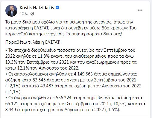 «Το μόνο δικό μου σχόλιο για τη μείωση της ανεργίας, όπως τη καταγράφει η ΕΛΣΤΑΤ, είναι ότι συνέβη εν μέσω δύο κρίσεων: του κορονοϊού και της ενέργειας. Τα συμπεράσματα δικά σας!» σχολιάζει σε ανάρτηση του ο υπουργός Εργασίας και Κοινωνικών Υποθέσεων, Κωστής Χατζηδάκης.