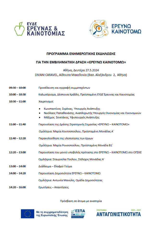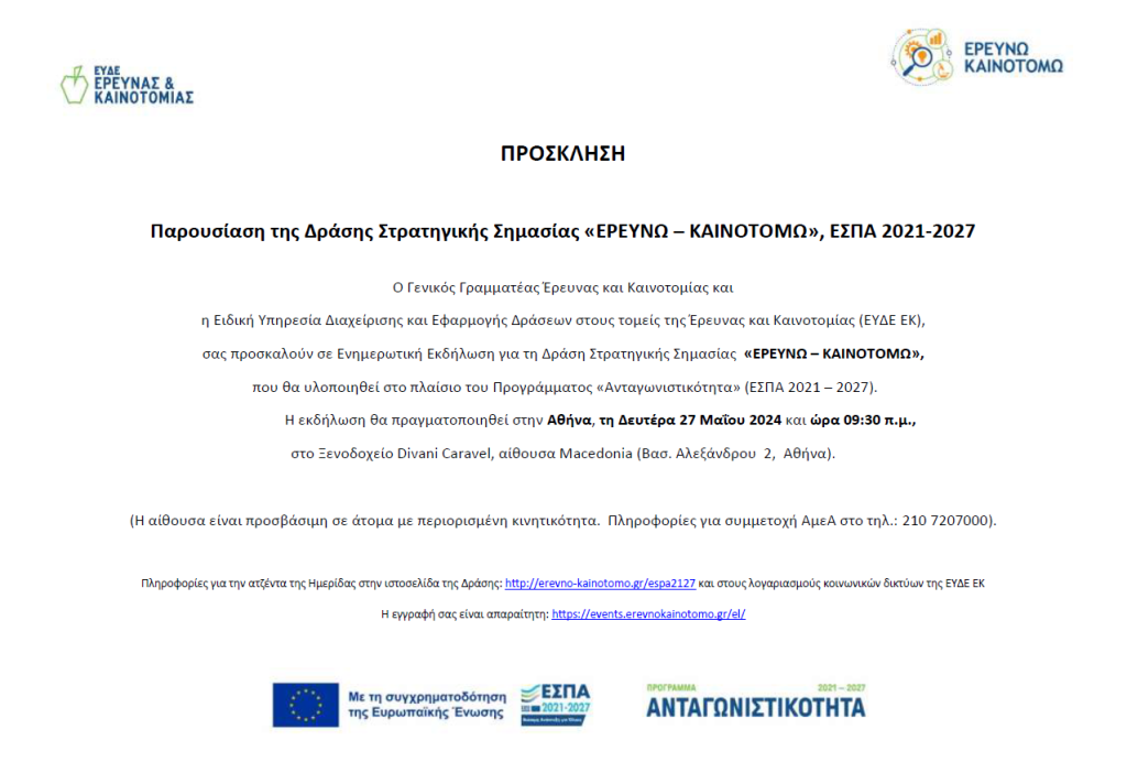Την Δευτέρα 27 Μαΐου στις 09:30, στο ξενοδοχείο Divani Caravel, θα πραγματοποιηθεί η παρουσίαση του «Ερευνώ – Καινοτομώ», μιας Δράσης Στρατηγικής Σημασίας του υπουργείου Ανάπτυξης στο πλαίσιο του Προγράμματος «Ανταγωνιστικότητα» (ΕΣΠΑ 2021 – 2027).