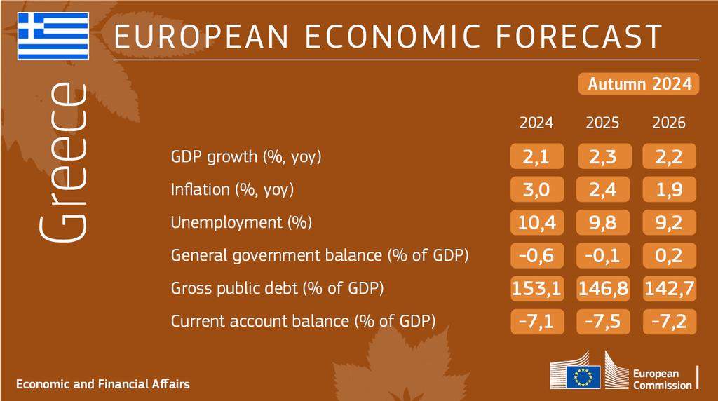 Η αύξηση του ΑΕΠ στην Ελλάδα αναμένεται να διαμορφωθεί στο 2,1% το 2024 στο 2,3% το 2025 και στο 2,2% το 2026, υποστηριζόμενη από την εφαρμογή του Σχεδίου Ανάκαμψης και Ανθεκτικότητας (RRP). Η πρόβλεψη της Επιτροπής για την αύξηση του ΑΕΠ το 2024 στην ευρωζώνη είναι 0,8% και 0.9% στην ΕΕ, ενώ για το 2025 το ΑΕΠ προβλέπεται να επιταχυνθεί κατά 1,3% στην ευρωζώνη και 1,5% στην ΕΕ και το 2026 κατά 1,6% και 1,8% αντιστοίχως.
