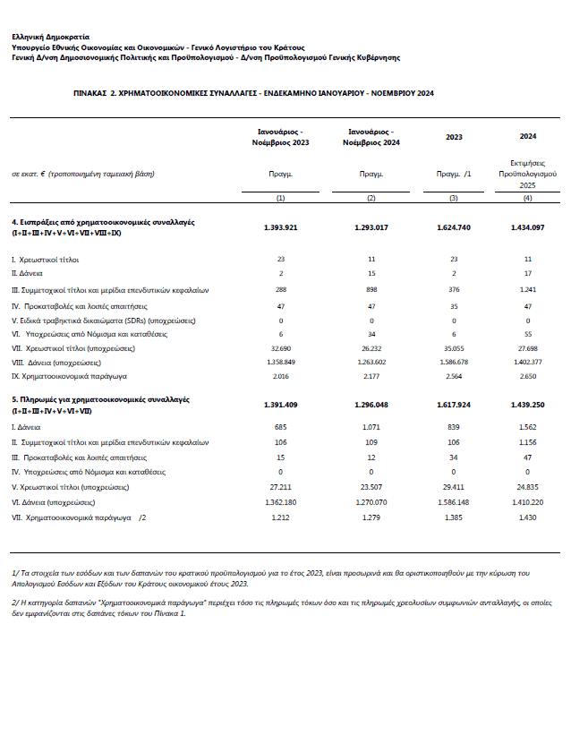 Ειδικότερα τον Νοέμβριο 2024 το σύνολο των καθαρών εσόδων του κρατικού προϋπολογισμού ανήλθε στα 5.391 εκατ. ευρώ, αυξημένο κατά 53 εκατ. ευρώ έναντι του μηνιαίου στόχου.