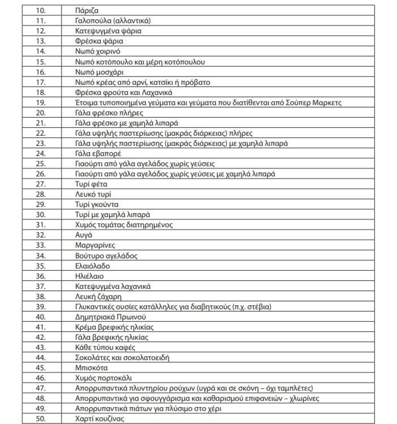 Στην απόφαση περιλαμβάνεται ο αναλυτικός κατάλογος των 63 κατηγοριών αγαθών που θεωρούνται απαραίτητα για τη διατροφή και τη διαβίωση των καταναλωτών.