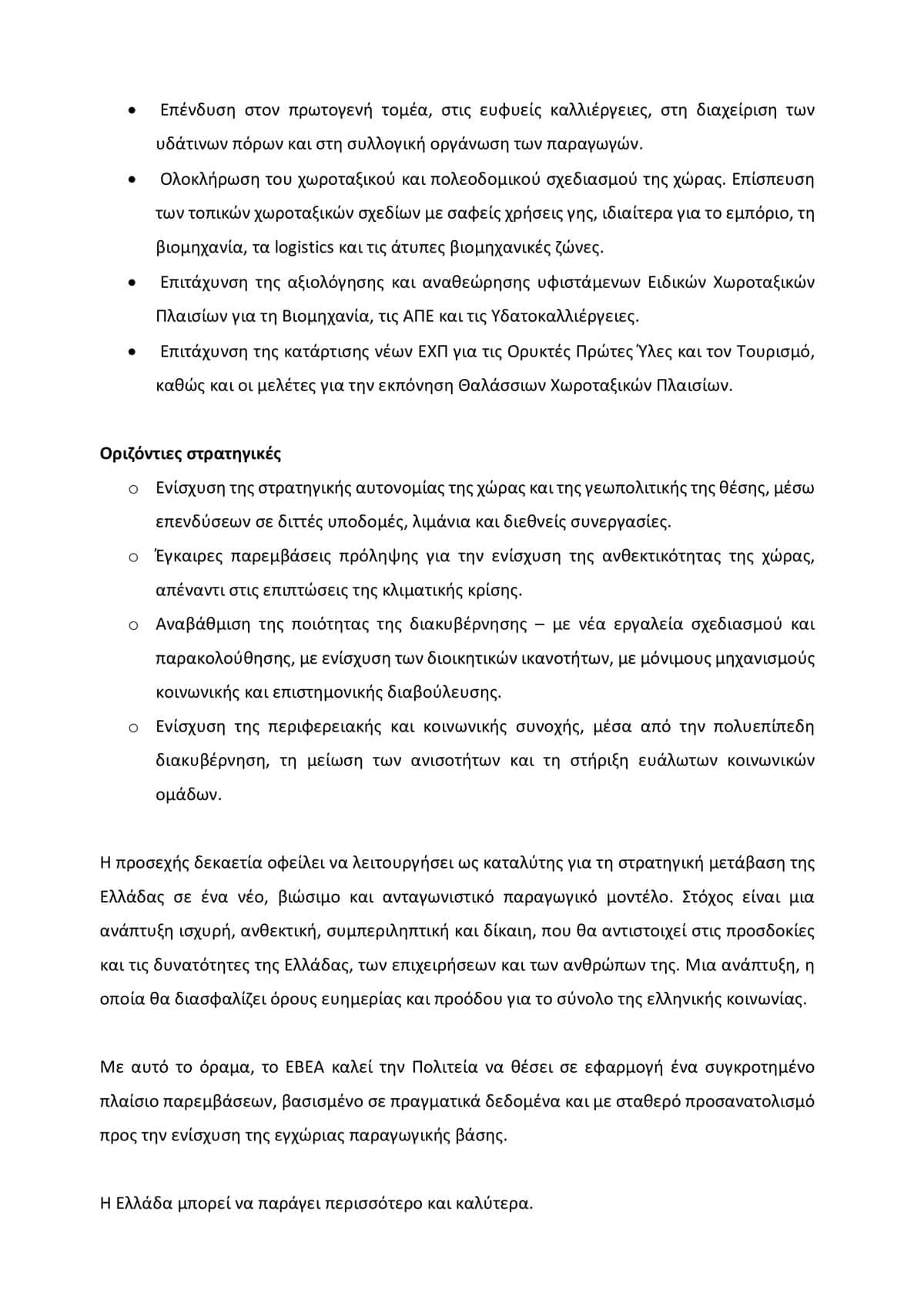 Ο Πρόεδρος του ΕΒΕΑ, κ. Γιάννης Μπρατάκος, δήλωσε: «Η προσεχής δεκαετία πρέπει να λειτουργήσει ως καταλύτης για τη στρατηγική μετάβαση της Ελλάδας σε ένα νέο, βιώσιμο και ανταγωνιστικό παραγωγικό μοντέλο. Στόχος μας είναι μια ανάπτυξη ισχυρή, ανθεκτική, συμπεριληπτική και δίκαιη, που θα αντιστοιχεί στις προσδοκίες και τις δυνατότητες της Ελλάδας, των επιχειρήσεων και των ανθρώπων της. Καλούμε την Πολιτεία να θέσει σε εφαρμογή ένα συγκροτημένο πλαίσιο παρεμβάσεων, βασισμένο σε πραγματικά δεδομένα και με σταθερό προσανατολισμό προς την ενίσχυση της εγχώριας παραγωγικής βάσης, γιατί πιστεύουμε ακράδαντα ότι η Ελλάδα μπορεί να παράγει περισσότερο και καλύτερα».