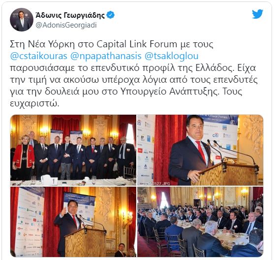 Επικεφαλής επιχειρηματικής αποστολής στη Νέα Υόρκη ο Άδωνις Γεωργιάδης είχε την ευκαιρία μαζί με τον Υπουργό Οικονομικών Χρήστο Σταϊκούρα, τον Αναπληρωτή Υπουργό Ανάπτυξης και Επενδύσεων Νίκο Παπαθανάση και τον υφυπουργό Εργασίας και Κοινωνικών Υποθέσεων Πάνο Τσακλόγλου, να παρουσιάσουν στο Capital Link Forum στη Νέα Υόρκη το επενδυτικό προφίλ της Ελλάδος.