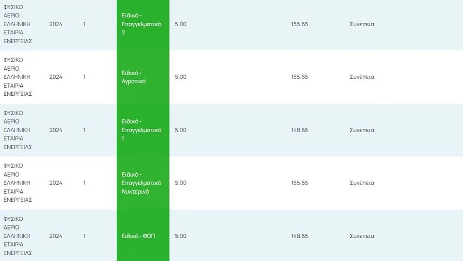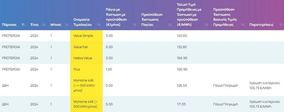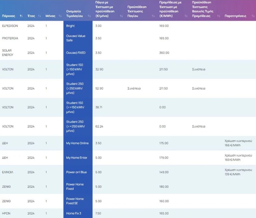 Ο πίνακας περιλαμβάνει την πάγια χρέωση και την τελική τιμή προμήθειας του σχετικού μήνα, κατόπιν υπολογισμού τυχόν εκπτώσεων. Για τη διαφανή ενημέρωση των καταναλωτών, αναγράφεται η προϋπόθεση βάσει της οποίας χορηγείται η εκάστοτε έκπτωση.
