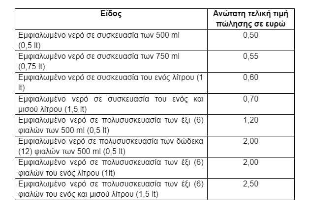 Συγκεκριμένα, για τις επιχειρήσεις κάθε είδους που διακινούν εμφιαλωμένο νερό καθορίζεται η εξής ανώτατη τελική τιμή: