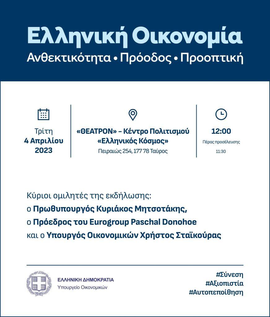 Το Υπουργείο Οικονομικών οργανώνει αύριο, Τρίτη 4 Απριλίου 2023, στις 12.00 το μεσημέρι εκδήλωση με θέμα: «Ελληνική Οικονομία: Ανθεκτικότητα – Πρόοδος – Προοπτική».