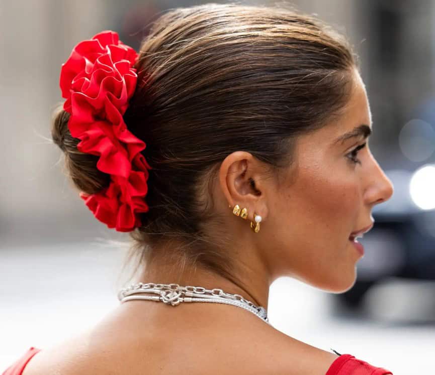 Η συγκεκριμένη τάση δεν είναι νέα, αλλά για αρκετά χρόνια έμενε εκτός προσκήνιου. Το 2025 όμως επιστρέφει πιο δυναμικά από ποτέ, φέρνοντας μαζί της έναν αέρα ρετρό κομψότητας. Το scrunchie, που αγαπήθηκε τη δεκαετία του ’90 και του 2000, ξεχωρίζει χάρη στο πλούσιο ύφασμά του και λειτουργεί ως ένα κομψό statement στα μαλλιά. Αυτή τη φορά βέβαια, δεν εμφανίζεται σε παιδικά κοτσιδάκια, αλλά σε χαμηλούς κότσους που αποπνέουν θηλυκότητα και αέρα quiet luxury.